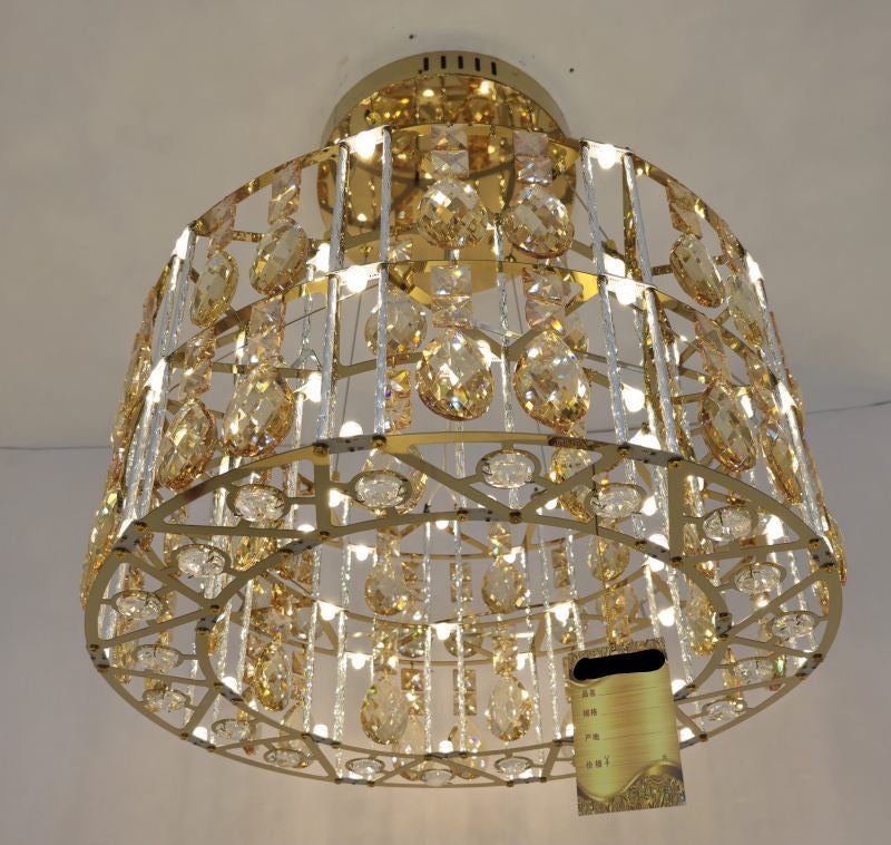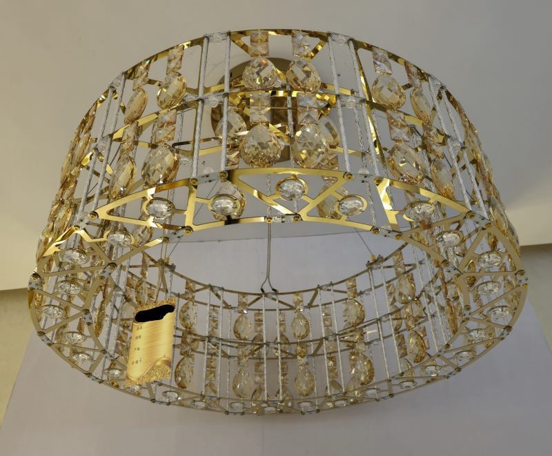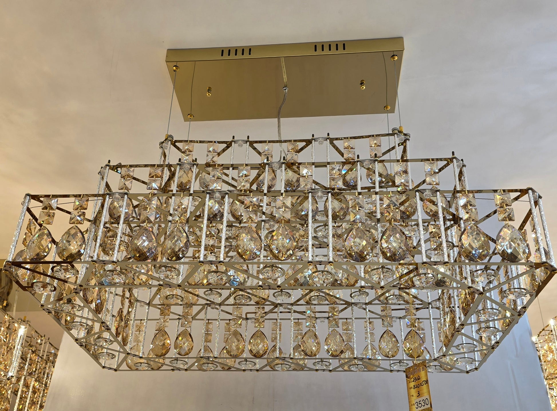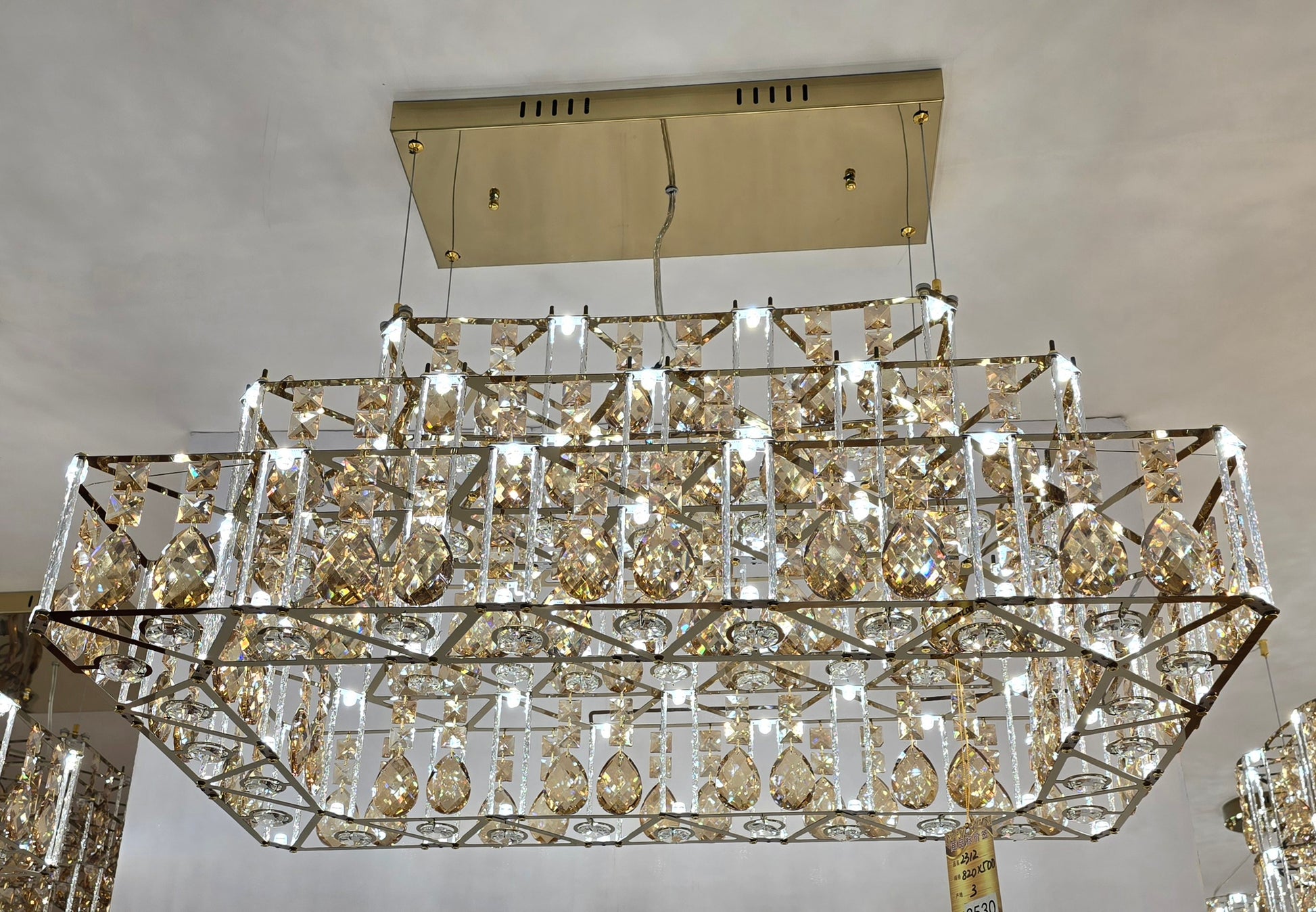 The Glowing Mirage Chandelier features a contemporary design with layered crystal panels that create a glowing effect. This chandelier is perfect for modern interiors."
