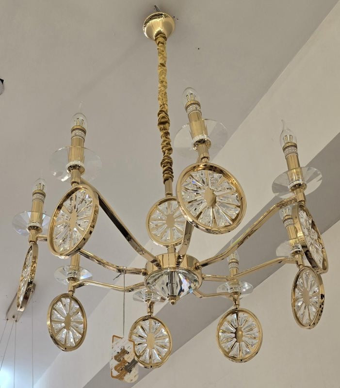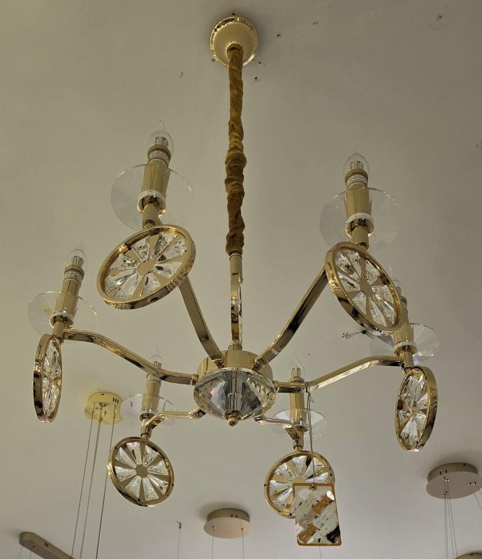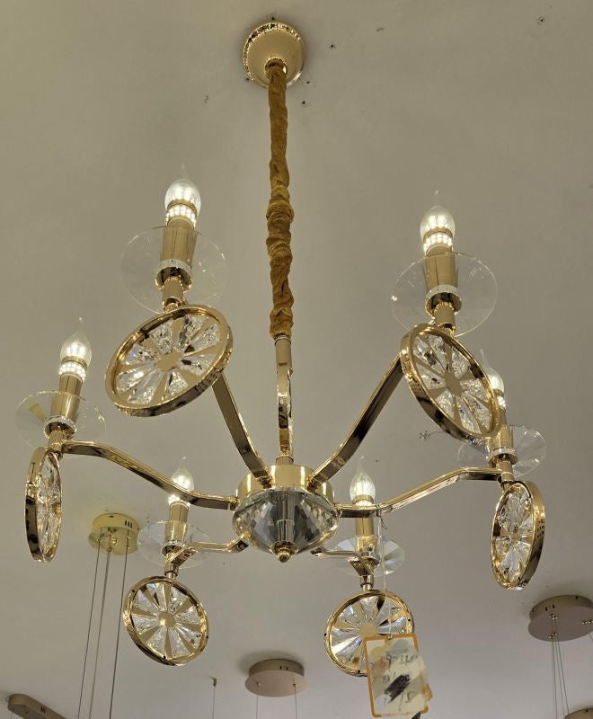 Illuminate your space with the Iron Glow Chandelier. Its crystal droplets and sleek metal frame create a dazzling light effect, perfect for enhancing any room."